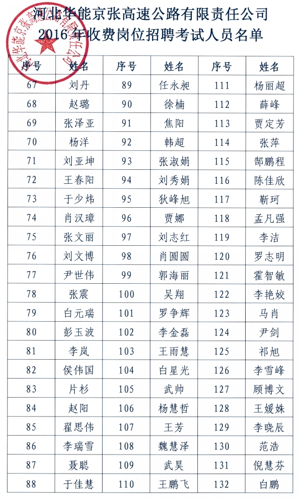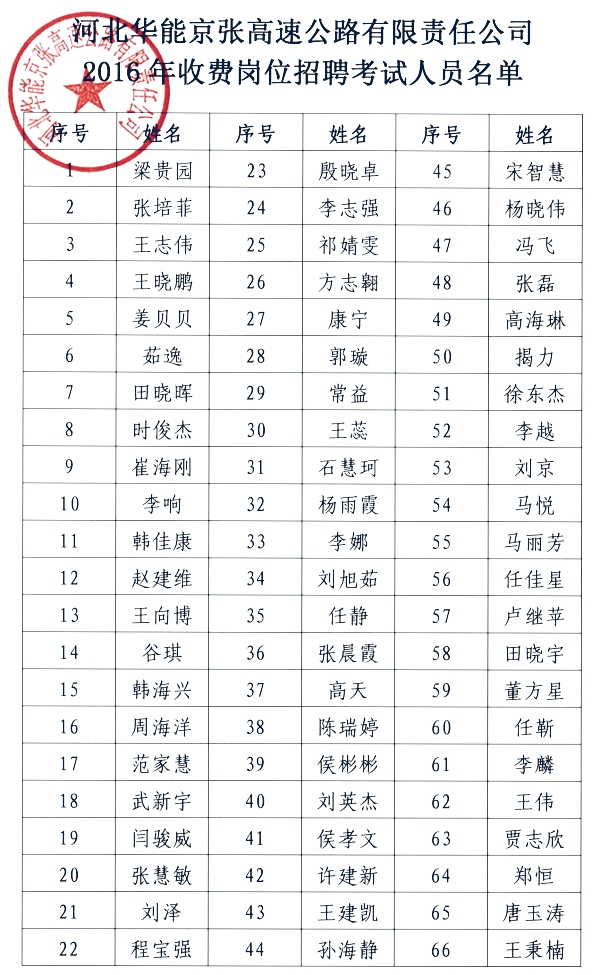2016年收費崗位招聘考試人員名單